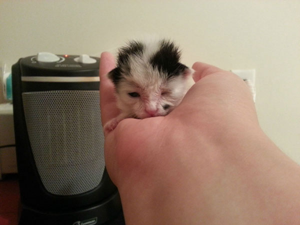 Όταν βρέθηκε αυτό το γατάκι ήταν μόλις δυο ήμερων, είχε κολλήσει κάτω από έναν κορμό δέντρου και καλυπτόταν από σκουλήκια.